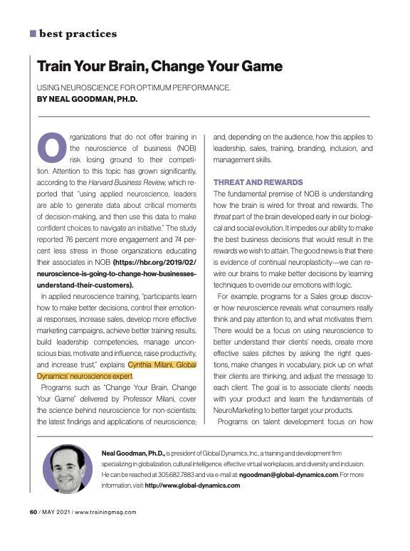 "We have had a lot of trainers come and go over the years, but none of them can do what Cynthia Milani can do. Her expertise across cultures is unique, and she has skillfully guided us through our mergers & acquisitons, conflicts, team building, and culture bridging phases. We could not have done it without her unique skill set, knowledge. and experience “with the brain in mind”.